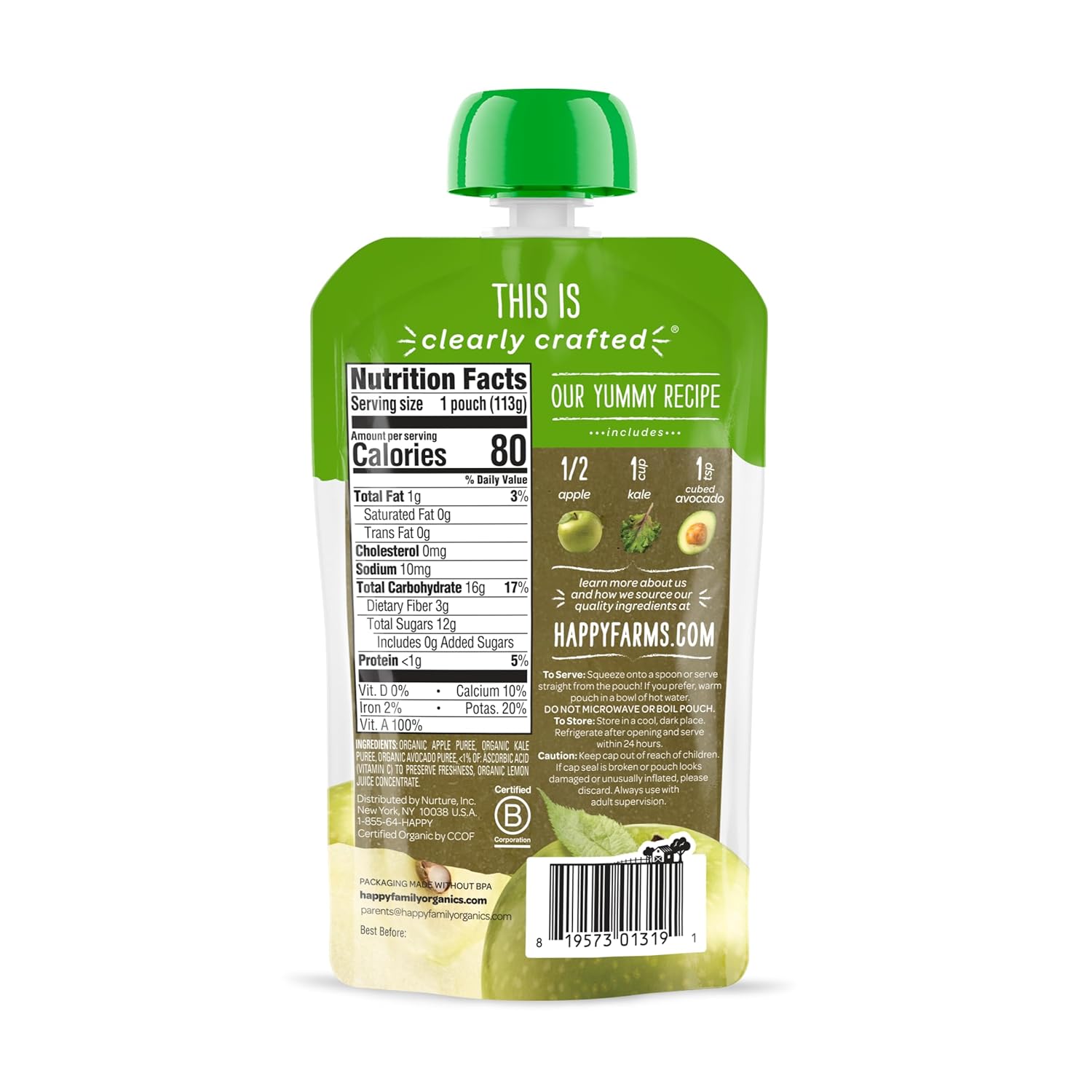 Happy Baby Organics Stage 2 Baby Food Pouches, Gluten Free, Vegan & Healthy Snack, Clearly Crafted Fruit & Veggie Puree, Apples, Kale & Avocados, 4 Ounces (Pack of 16)