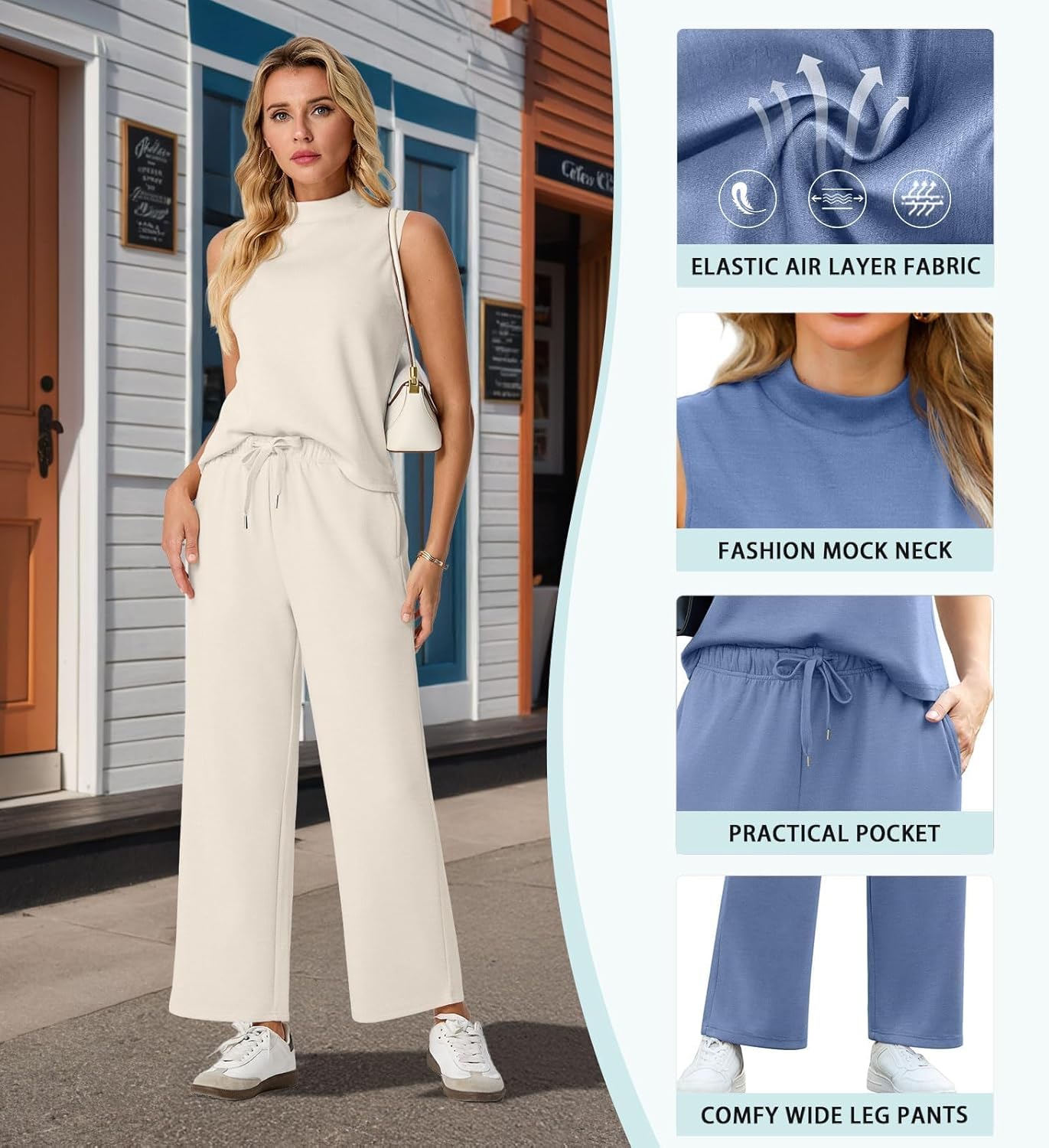 Lepunuo Two Piece Sets for Women Summer Mock Neck Sleeveless Top Wide Leg Pants Lounge Sets Vacation Travel Outfits