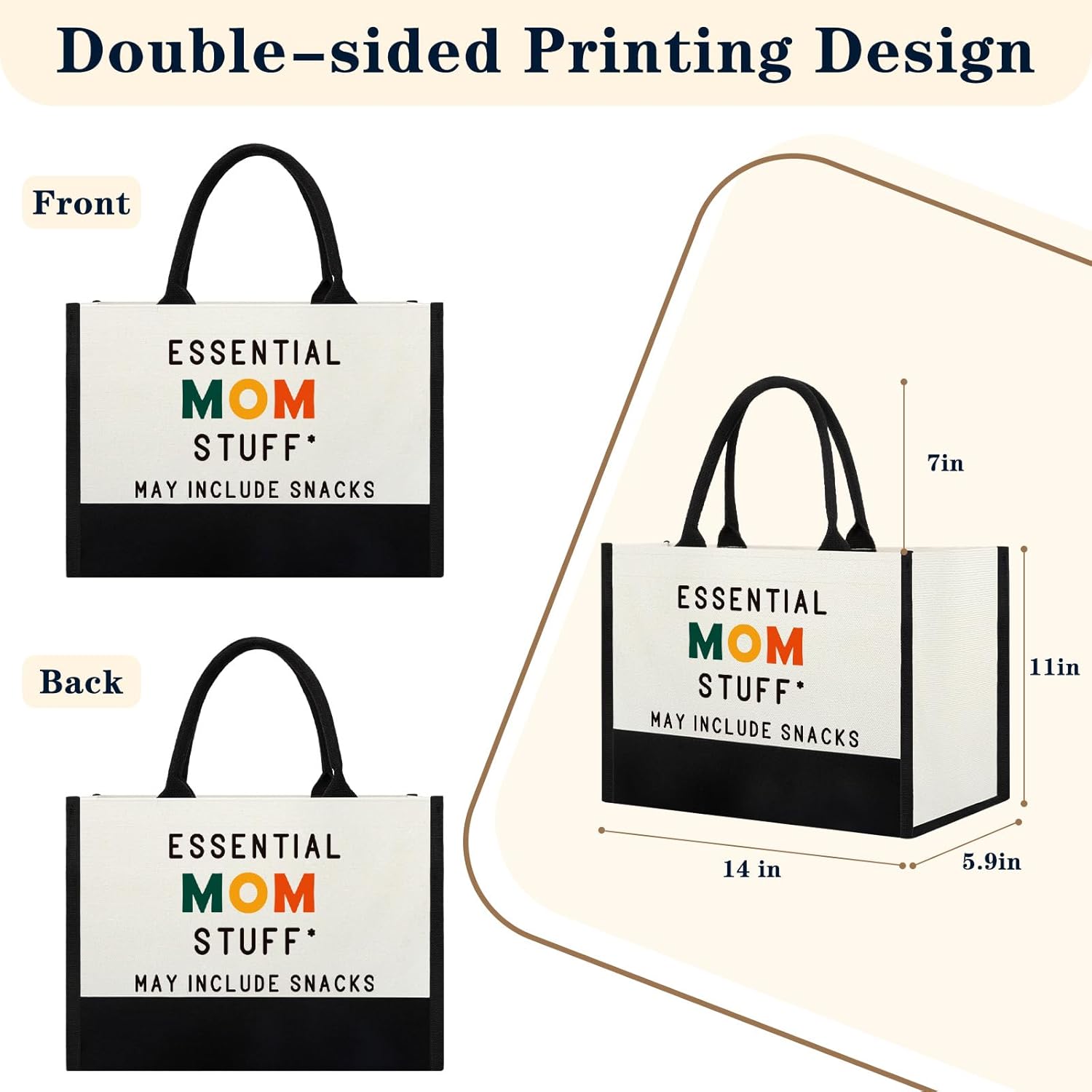 First Mother’s Day Gifts for New Mom: Give your mommy a timeless and unique tote bag with funny words “ESSENTIAL MOM STUFF – MAY INCLUDE SNACKS”; This thoughtful gift is perfect for Mother’s Day which is a heartfelt way to show your appreciation